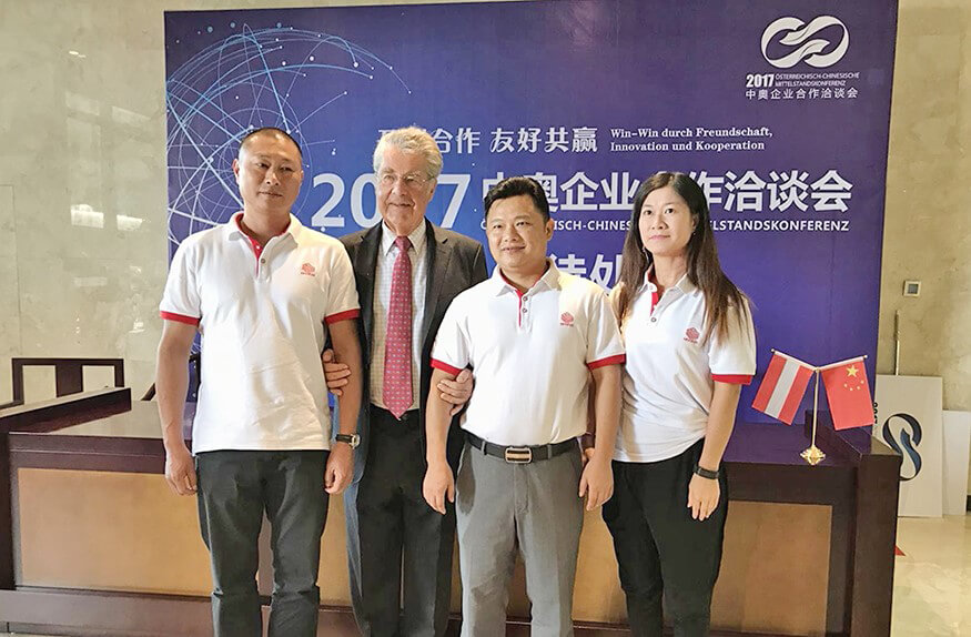 奥地利前总统海因茨·菲舍尔与yabo鸭脖智能副总裁戴宝、揭阳分公司总经理林浩生、公司总裁助理郑庆丽合影